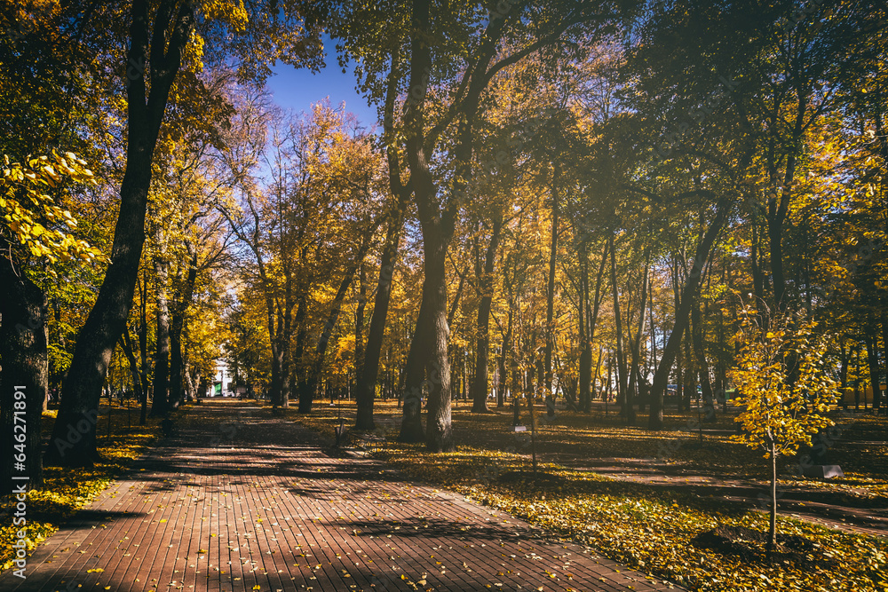 Leaf fall in the city park in golden autumn. Landscape with maples and other trees on a sunny day. Vintage film aesthetic.