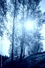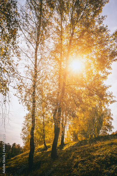 Yellow leaf fall in the birch grove in golden autumn on sunset. Landscape. Vintage film aesthetic.