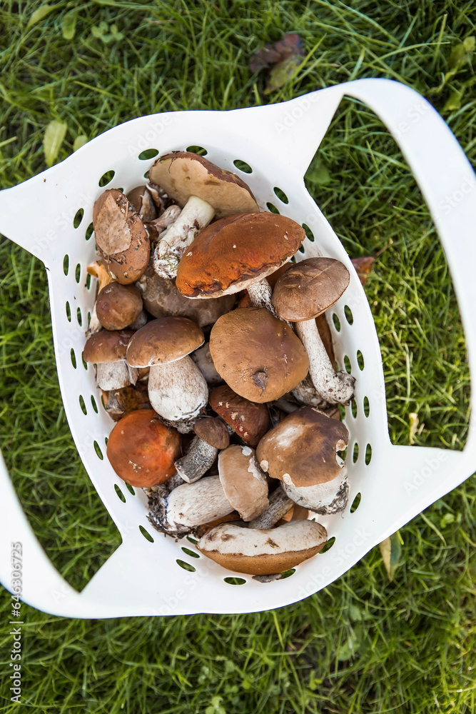 Noble, royal mushrooms. Porcini mushrooms, aspen, podberezoviki. Mushrooms in the basket. Mushroom picking in autumn.
