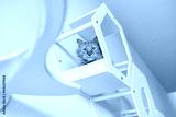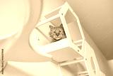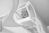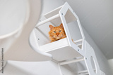 Red cat sitting in wooden cat white furniture on white wall