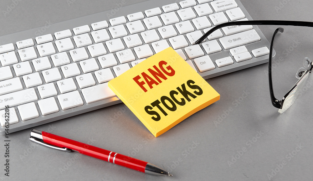 FANG STOCKS text on a sticky with keyboard, pen glasses on grey background