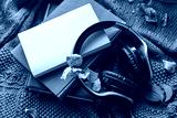 Audiobook or podcast in fall season. Wireless headphones with books and autumn leaves on knitted plaid as concept of learning and education, online courses or music app in cozy fall mood.
