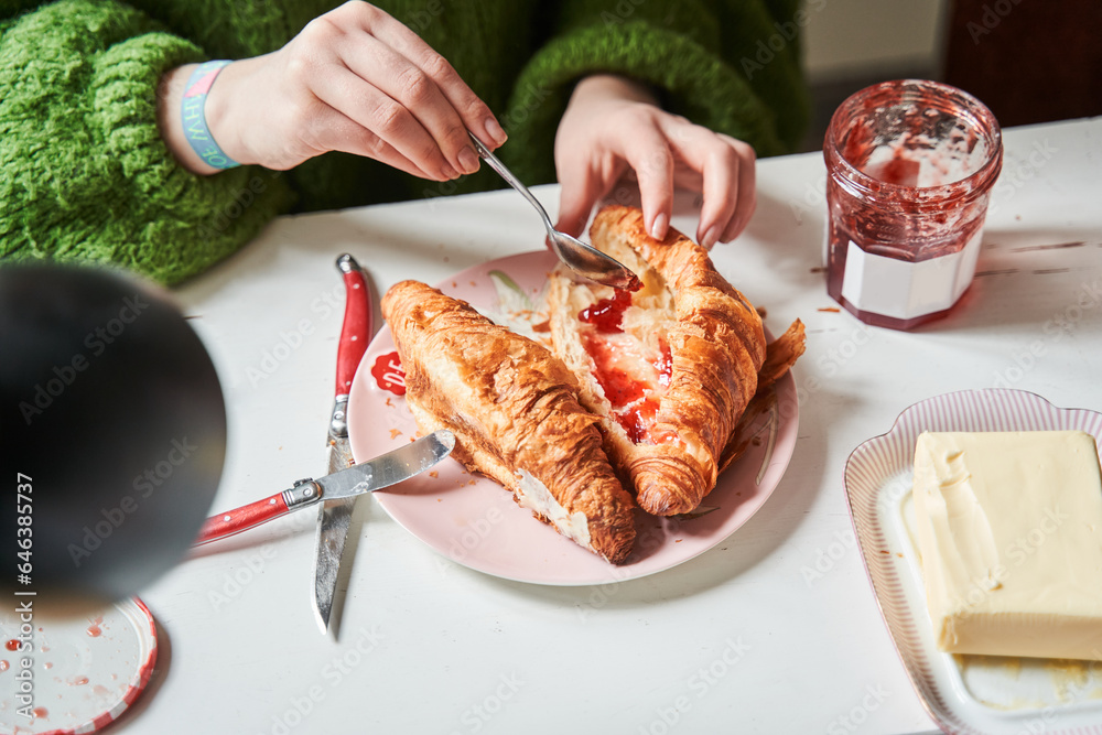 Cropped view of the girl putting jam at the croissant while having breakfast