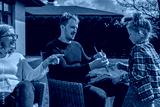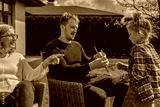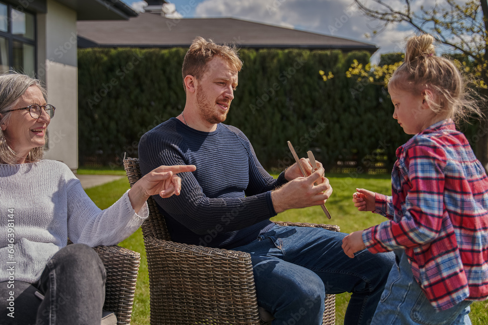 Positive grandfather, her son and granddaughter playing at the garden near the house
