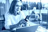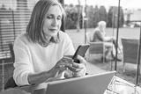 Mature grey haired woman looking at the smartphone screen with calm expression