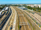 Krakow, Poland. Big train hub, outdoor and indoor garage with train sheds, fast city trains, old and new carriages, many railroad tracks, rails and electric traction. Aerial view