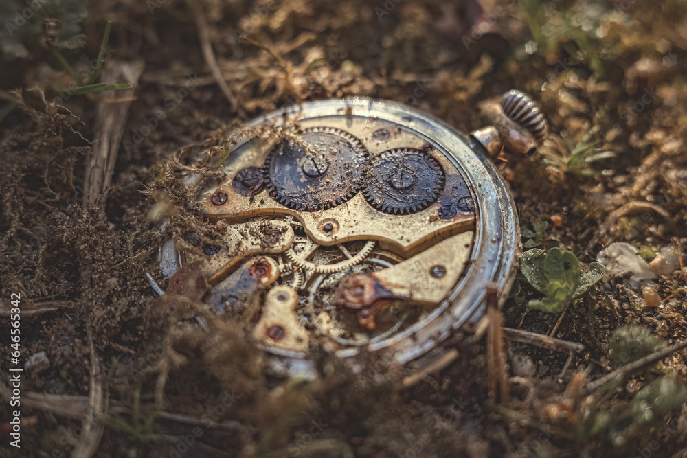 A rusty mechanism with gears on a pocket watch. The spread of rust on the surface.