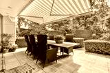 an outdoor dining area with table and chairs under a large yellow striped awning over the patio, surrounded by lush green trees