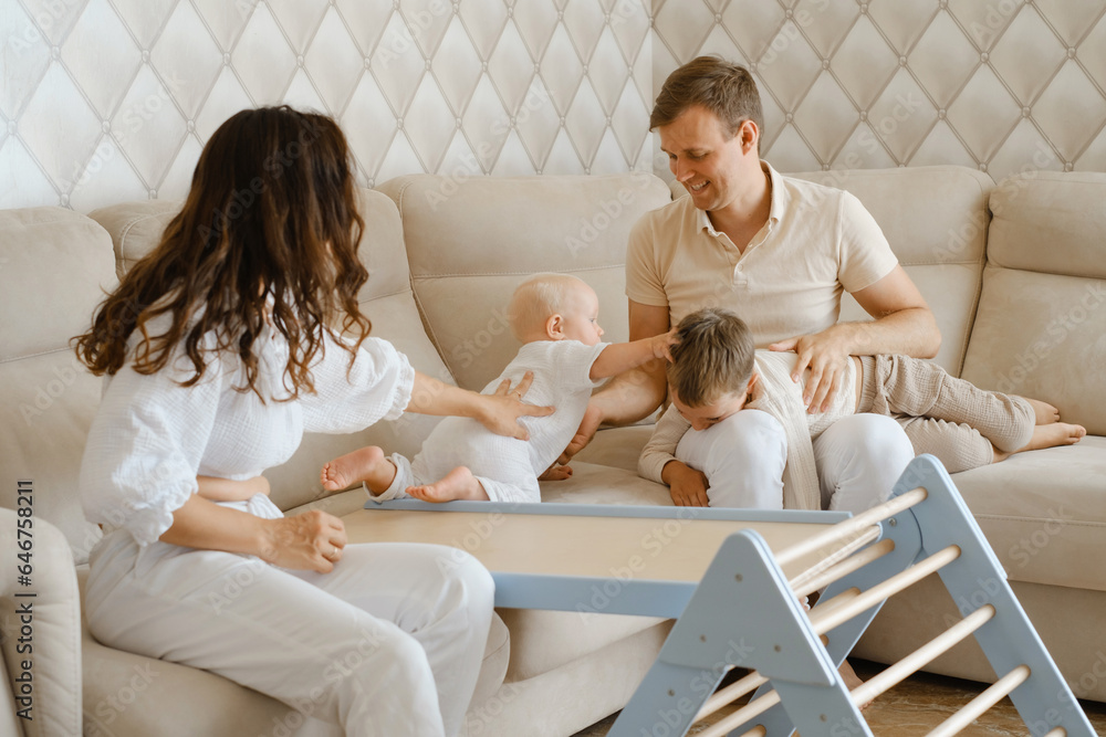 Family with two kids on the couch having fun. Mather, father baby and toddler sons are happy in the morning in Livingroom. Children playing on Toddler Indoor Gym Playset for children, ladder Climbing