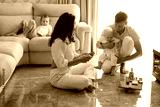 Family with two kids on the couch having fun. Mather, father baby and toddler sons are happy in the morning in Livingroom. Children playing with building blocks at home. Real life and quality time