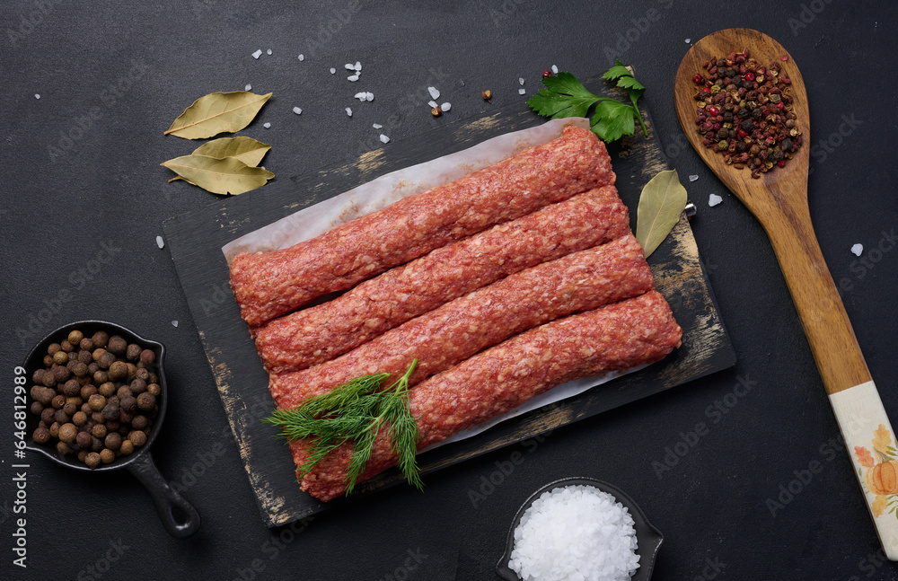 Raw lula kebab sausages on a board and spices, top view