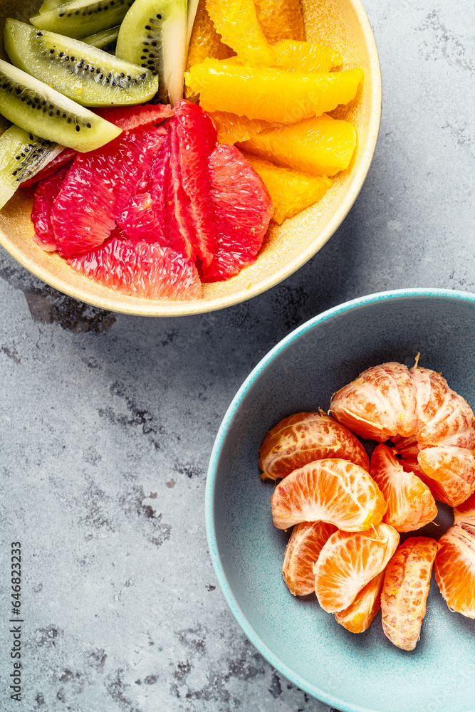 Bowls with fresh fruits (grapefruits, tangerines, oranges, and kiwi), preparing fruit salad, ingredients