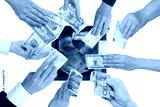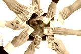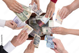 Kollage von Händen mit verschiedenen Währungen, Konzept crowdf