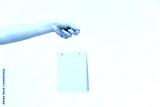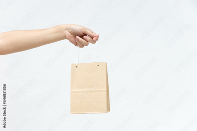 Hand of business woman hold brown paper shopping bag on white concrete background