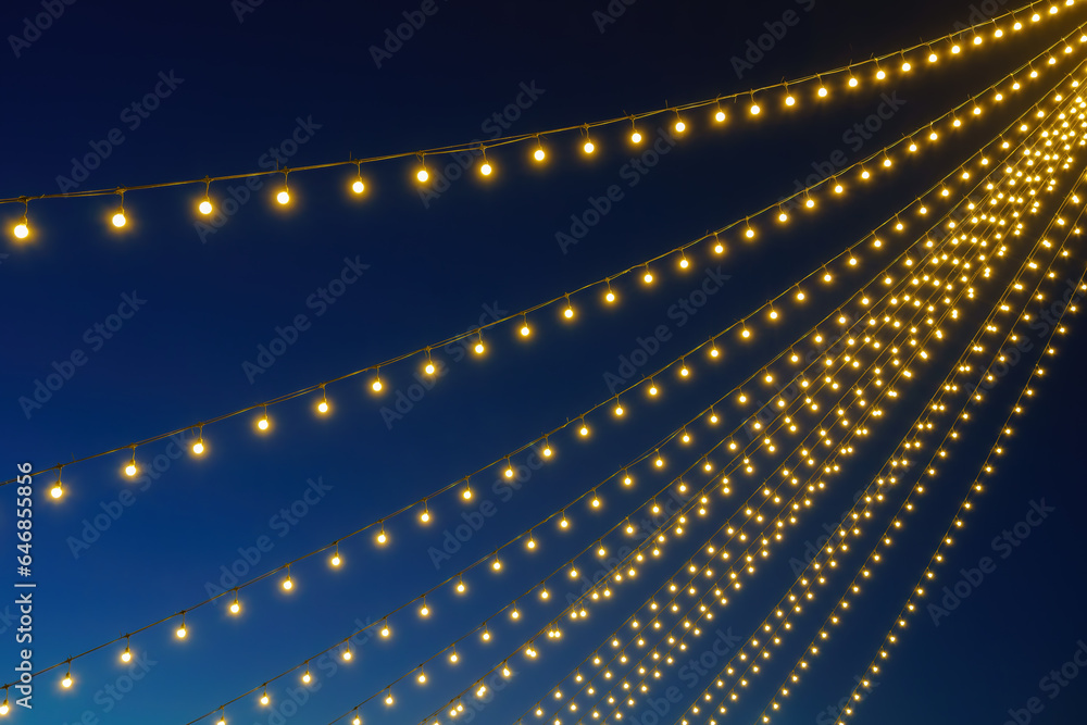 Holiday garlands with tunsgen golden lamps against the black night sky. Celebration decorations.