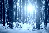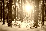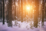 Sunset or sunrise in the winter pine forest covered with a snow. Rows of pine trunks with the sun's rays. Vintage film aesthetic.