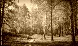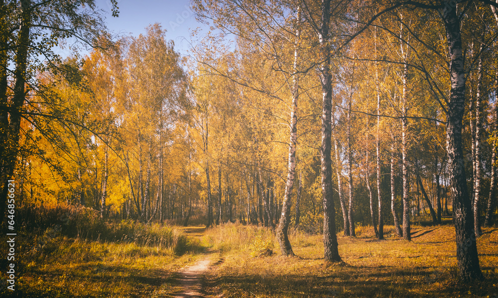 Birch grove with golden leaves in golden autumn, illuminated by the sun at sunset or dawn. Aesthetics of vintage film.