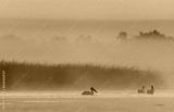 Photo of a flock of birds gracefully gliding on the tranquil surface of a serene lake