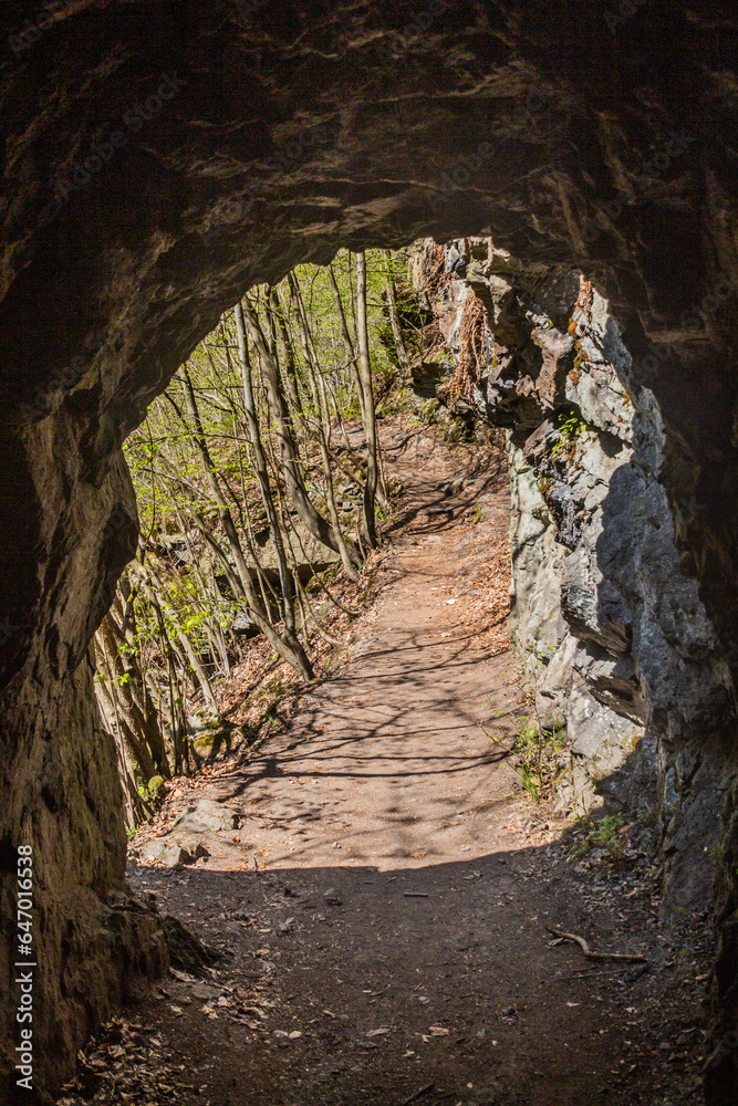 Trail with a tunnel in Jizera river valley near Semily, part of Riegrova stezka path, Czechia