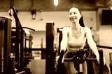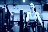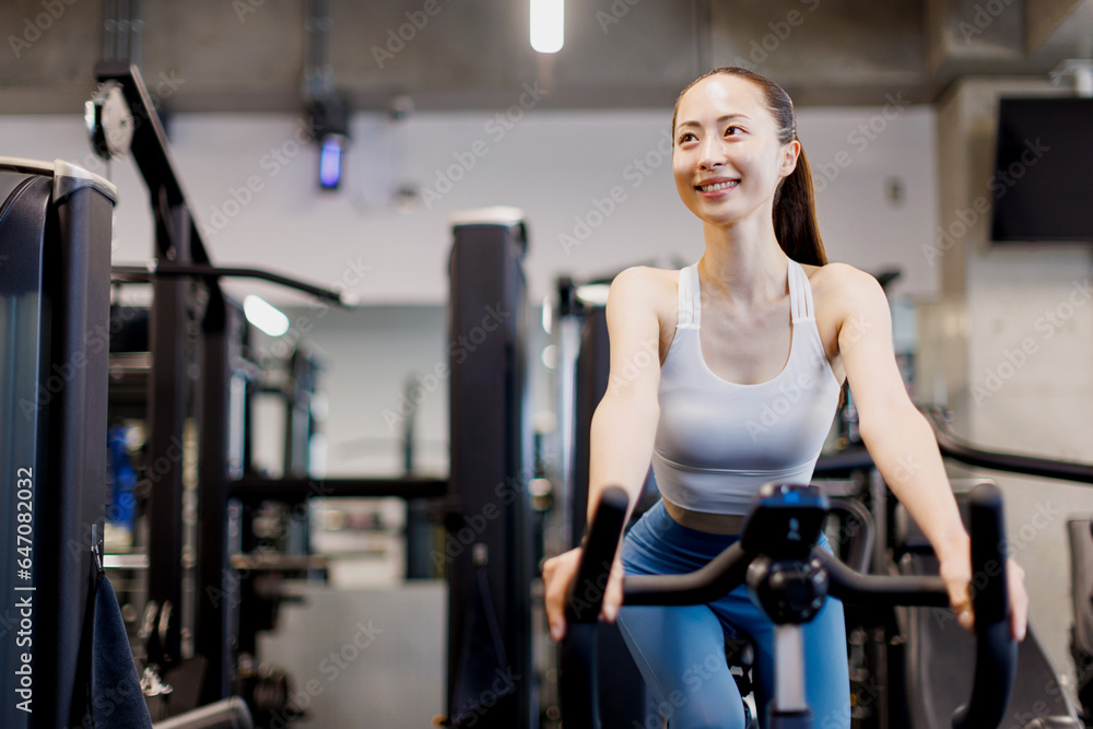 エクササイズバイクに乗っている若いアジアの女性