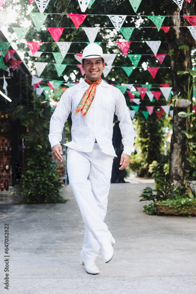 Latin man wearing traditional Mexican custom called "jarocho" traditional from Veracruz Mexico Latin America, young hispanic people in cultural Festival