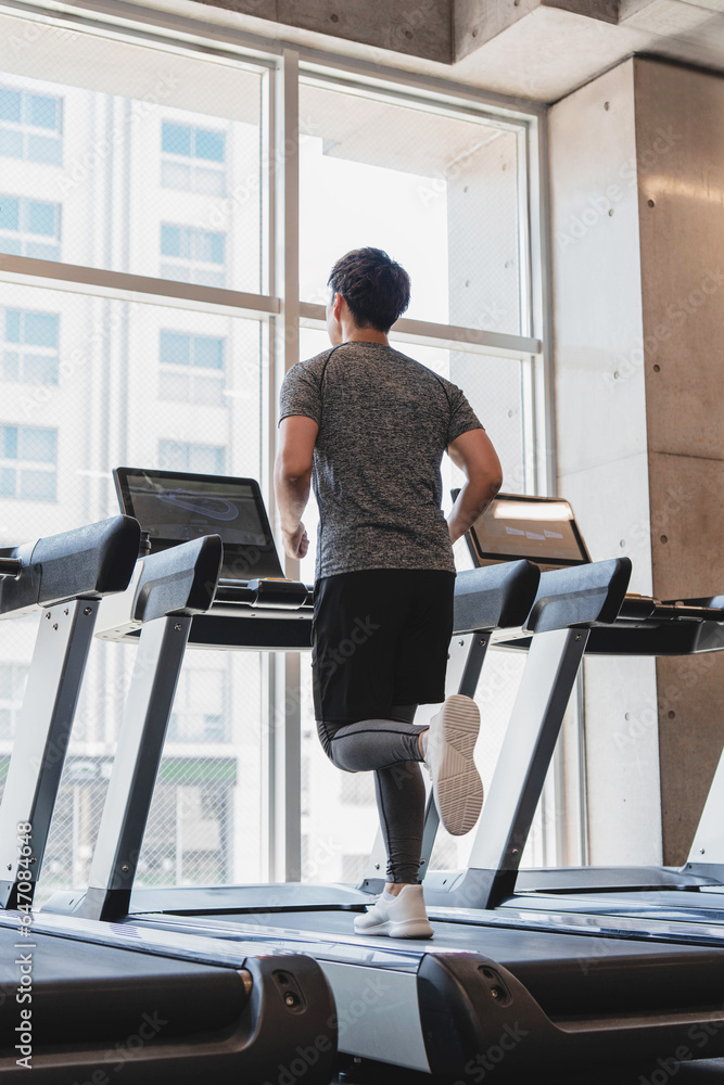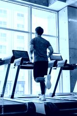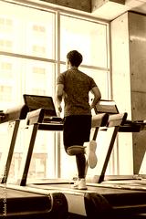 トレッドミルで走っている若い男