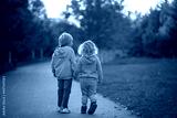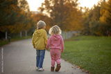 Cute blond toddler children boy and girl,walking in autumn park on sunset, enjoying the beautiful nature