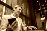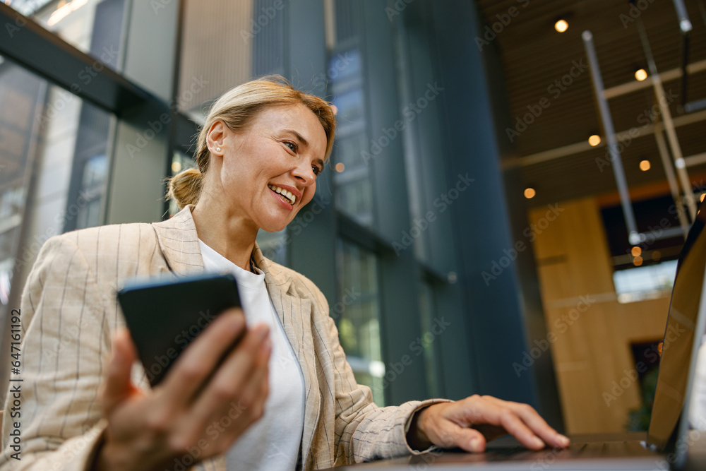 Stylish business woman use phone while sitting in modern coworking and working on laptop