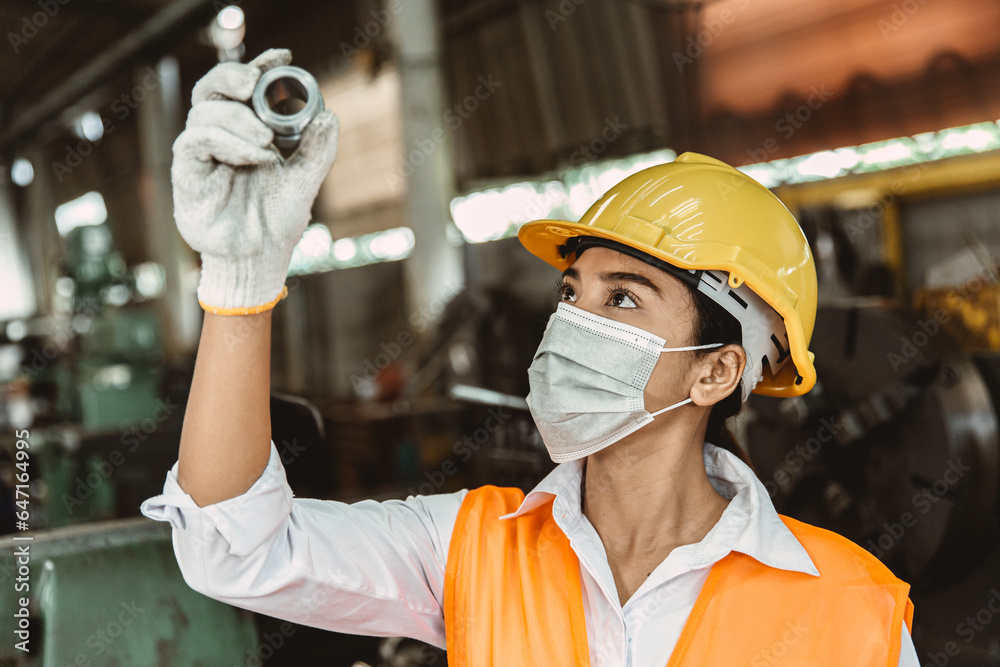 Young Asian woman worker hard working with heavy metal machine lathe milling factory industry dirty workplace waring face mask for hygiene.