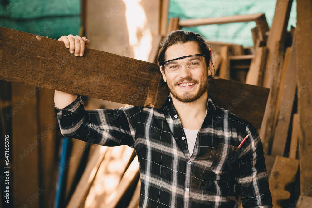 Portrait young carpenter artisan hand wood crafting man with wooden panel happy smiling