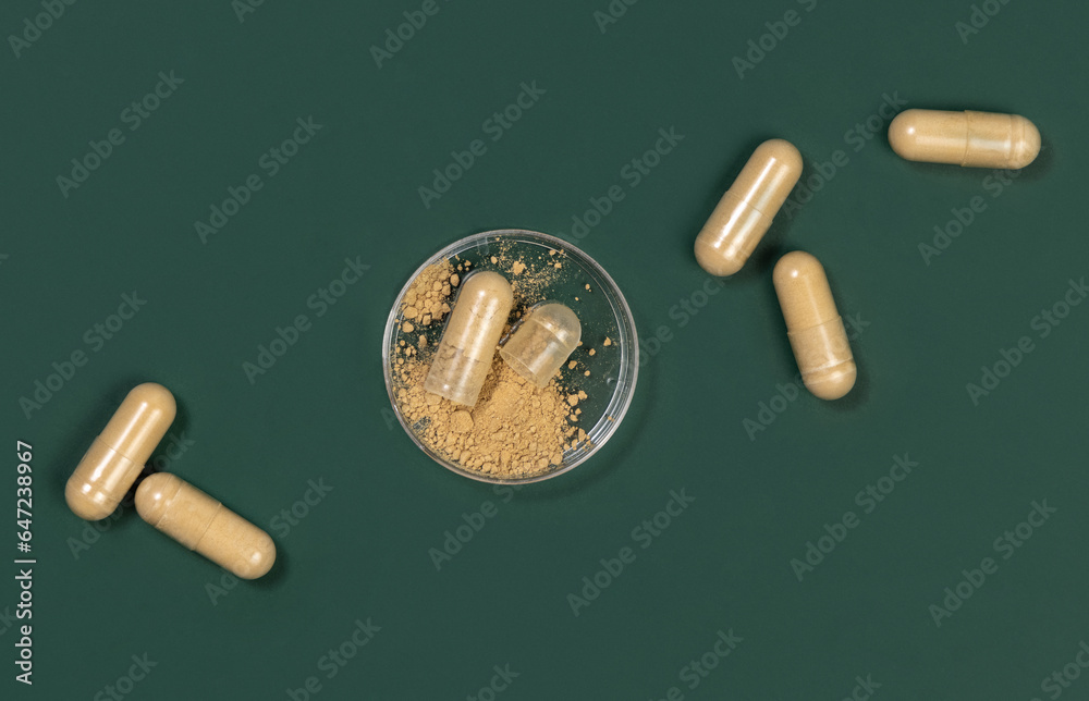 One capsule Opened in a jar on dark green. Taking dietary supplements with capsules