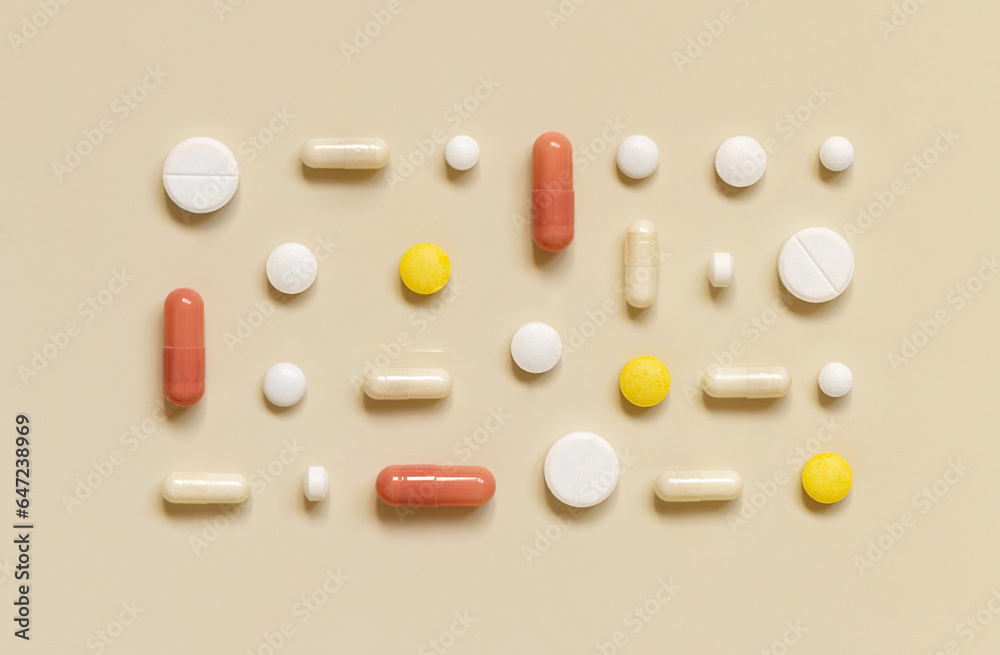 Mix of medical capsules and pills in a lines on light beige top view. Dietary supplements