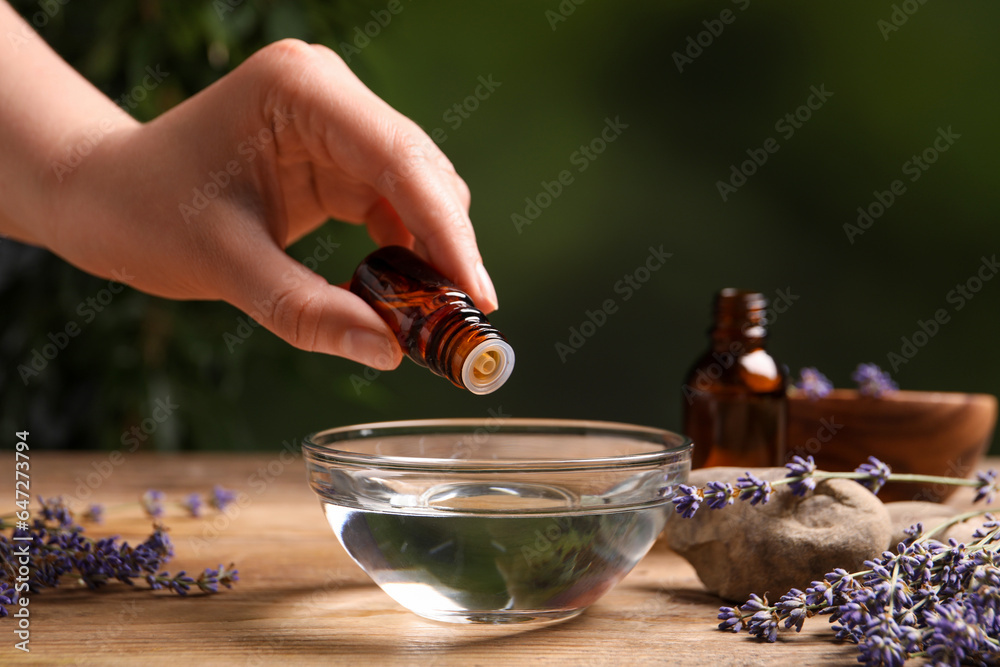 Woman dripping lavender essential oil from bottle into bowl at wooden table, closeup