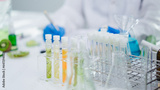 Close up of tissue of avocado, cucumber, kiwi, orange and tomato in test tube. Cosmetic laboratory. Experiment of vitamin in serum, skin care, lotion, treatment, essence and medical body product.