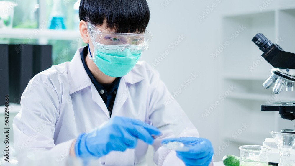 Scientist working in cosmetic laboratory to test and develop of aloe vera cream, lotion, shampoo or skin care. Discovery and experiment of product ingredients. Natural and herbal skin care study.