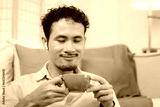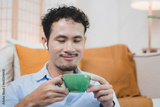 Portrait of cheerful young male student using laptop, mobile phone studying online from home or apartment. Concept of carefree, cosy, joyful, wellness at home, cyberspace, relax and enjoy weekend.