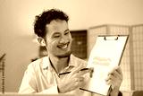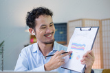A professional Asian salesman is giving a presentation of paper document to client with laptop from his home office. Concept of remote communication technology. Online seminar, conference or meeting.