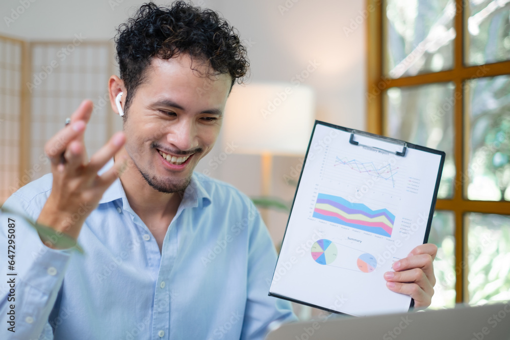 A professional Asian salesman is giving a presentation of paper document to client with laptop from his home office. Concept of remote communication technology. Online seminar, conference or meeting.
