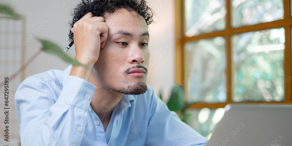 A sleepy male architect or entrepreneur work at home office. Concept of Napping, exhausted, overwork, relaxation and overload job. Asleep, bored and tired businessman in front of laptop. Day dreaming.