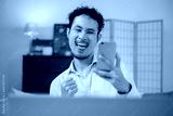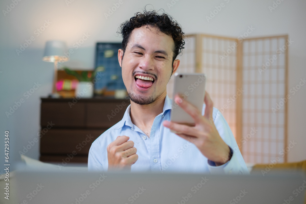 Young Asian businessman works on laptop with happy and smiling after finish job. He excited and success on work at home, Concept of achievement, big order, victory and surprise, freelance or employee.