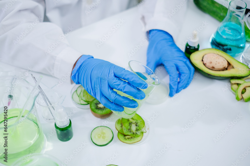 Close up scientist pouring sample of cucumber, avocado and kiwi gel, oil, serum to test and develop fruits skin care essence, moisturizer, medical, treatment increase quality of product in laboratory