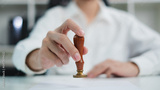 Businessman's hand stamping on paper. Concept of agreement, justice, approval and authority. Success business company complete. Insurance document approve signature or signing. Lawyer stamp guarantee