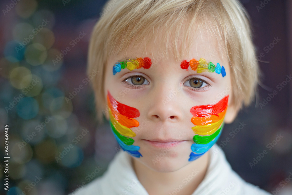 Beautiful child, toddler boy with painted face with rainbow, posing for close portrait