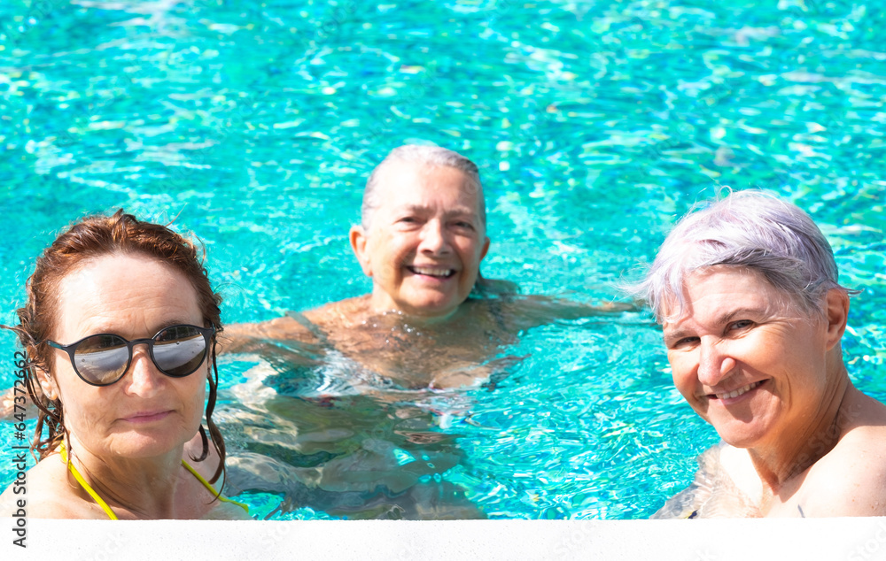 Three active mature senior caucasian friends women have fun in outdoor swimming pool under the sunlight. Vacation and healthy lifestyle concept