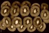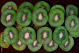 Above biew on ripe green kiwi fruits cut in slices on a dark background. Healthy fruits concept.