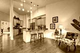 House interior with high ceiling. Kitchen area
