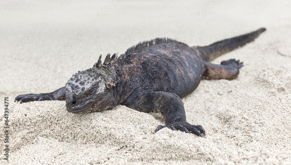 Galapagos marine iguana on sand, selective focus, Ecuador.