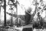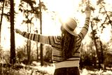 Beautiful woman in a stylish sweater and hat walks in the autumn forest, enjoys nature, feels freedom. Concept of nature, relaxation.