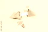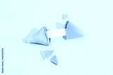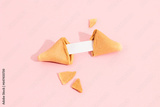 Fortune cookie on a pink background with deep long shadow. Blank paper for prediction words
