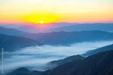 Morning dense fog in the mountainous forest area of ​​the Ukrainian Carpathians. Landscape in nature. Dawn in the mountains